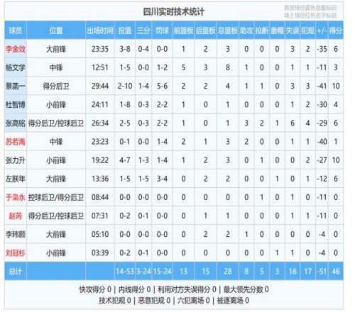 从本场比赛来看,四川队在第一节比赛只得了10分,然而,到了第二节比赛,更是只得了6分。就这样,整个上半场比赛,四川队一共是拿到了16分,这也是创造了CBA最低的半场得分。
