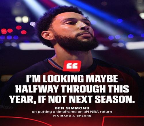 谈到自己可能重返NBA的时间表的时候,西蒙斯表示:“我预计可能是在本赛季中期,最晚下个赛季,这取决于我在接下来一个月左右的时间里能恢复得如何,但我感觉很好,没有任何反复。”
