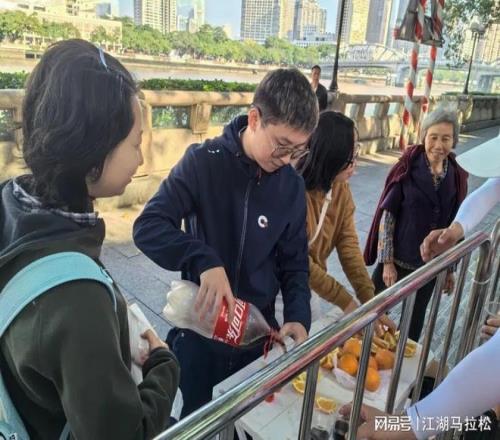 广州市民的热情,表现方式五花八门,多是街坊式的。当进入海珠区后,从25K到27K,赛道旁全是学生加油点,孩子们稚嫩的声音,是广马最动听的旋律。而当进入荔湾区时,又换了种风格,有无数的私补,市民们端着杯子、盘子,将饮料、食品往你手里塞。