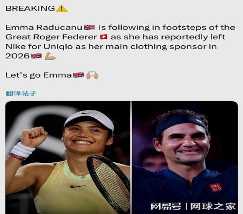 我们再来关注球员动态。北京时间昨晚,有外媒报道,称英国一姐拉杜卡努在2026赛季将结束和耐克4年的合作关系,转而牵手日本的服装赞助商优衣库。球迷们都知道,2018年,瑞士天王费德勒结束与耐克长达24年的合作,与优衣库签订了长达10年3亿美元的天价代言协议,成为这个品牌首位网球领域的全球大使。这一次,拉杜卡努也牵手优衣库,要和费天王作伴啦!至于双方的代言金额,目前还没有披露,估计也得是个大价钱。