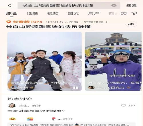 在大众参与层面,抖音同步打造系列创意话题,如#开板轻装滑、#用小雪打开轻装滑、#一年一度滑雪整活大赛等,内容覆盖雪场体验、穿搭技巧与亲子互动,吸引个人、好友、家庭多元参与,让滑雪知识轻量化传播,氛围感持续升温。