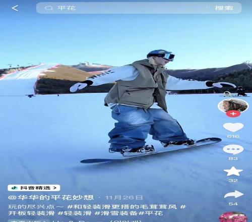 在抖音上,滑雪已从一项专业运动升级为一种生活方式与时尚表达,即让大家卸下传统滑雪繁重的装备与竞技压力,选择饱和度低、设计简约的轻量化雪服装备,实现从城市到雪场的无缝衔接,回归滑雪最本真的快乐,这也是“轻装滑”的核心本质。