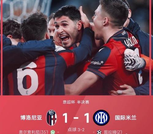 意超杯半决赛对决再出冷门,意甲领头羊国米在开场2分钟便取得领先的有利局面下,未能守住优势,随后被博洛尼亚1-1逼平拖入点球大战。最终,国米诸将在点球点崩盘,巴斯托尼、巴雷拉、博尼三人接连失点,最终以2-3不敌对手,总比分3-4无缘决赛,新帅齐沃冲击成年队执教首冠的脚步刚迈出便戛然而止。