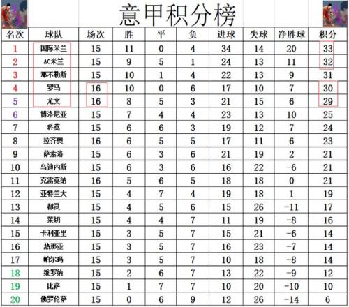 积分榜方面,榜首争夺竟然很激烈,国米1分优势力压AC米兰领跑,今天尤文击败罗马拿下争4大战后,从国米到尤文,依次都是1分之差。尤文现在只差罗马1分,也是看到了冲进前4的希望。