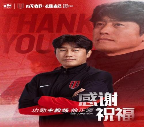 今天下午,成都蓉城足球俱乐部发布公告,宣布与主教练徐正源达成一致,终止合作不再续约,徐正源不再担任成都蓉城足球俱乐部一线队主教练职务。同时,为感谢徐正源为球队做出的卓越贡献,成都蓉城决定授予其成都蓉城足球俱乐部“功勋主教练”称号。