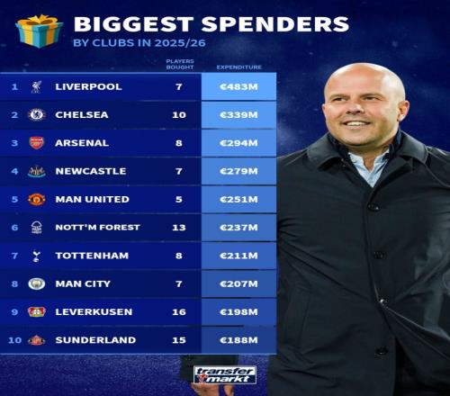 德转列本赛季俱乐部引援支出前10:英超9席,利物浦4.83亿第1