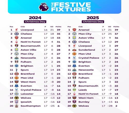 北京时间12月25日,德转列出了2024年和2025年圣诞节当天的英超积分榜,巧合的是,利物浦和阿森纳以相同的积分以及...
