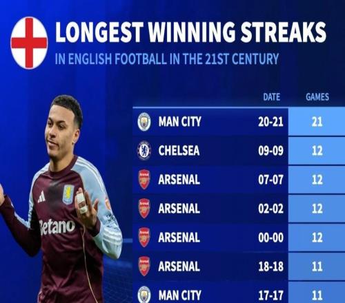 本世纪英超俱乐部各项赛事连胜纪录:曼城21连胜断档第一