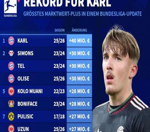 北京时间12月19日,德转更新了德甲球员的身价,拜仁慕尼黑17岁新星伦纳特-卡尔身价暴涨4000万欧元,从2000万欧元...