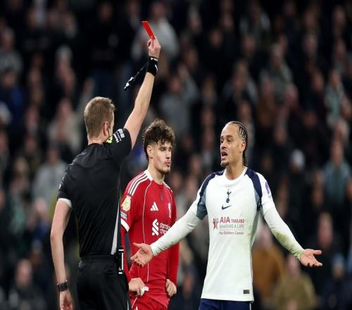 北京时间12月21日,在热刺与利物浦的比赛中,热刺球员哈维-西蒙斯踩踏自己荷兰国家队的队友范戴克,被裁判直红罚...